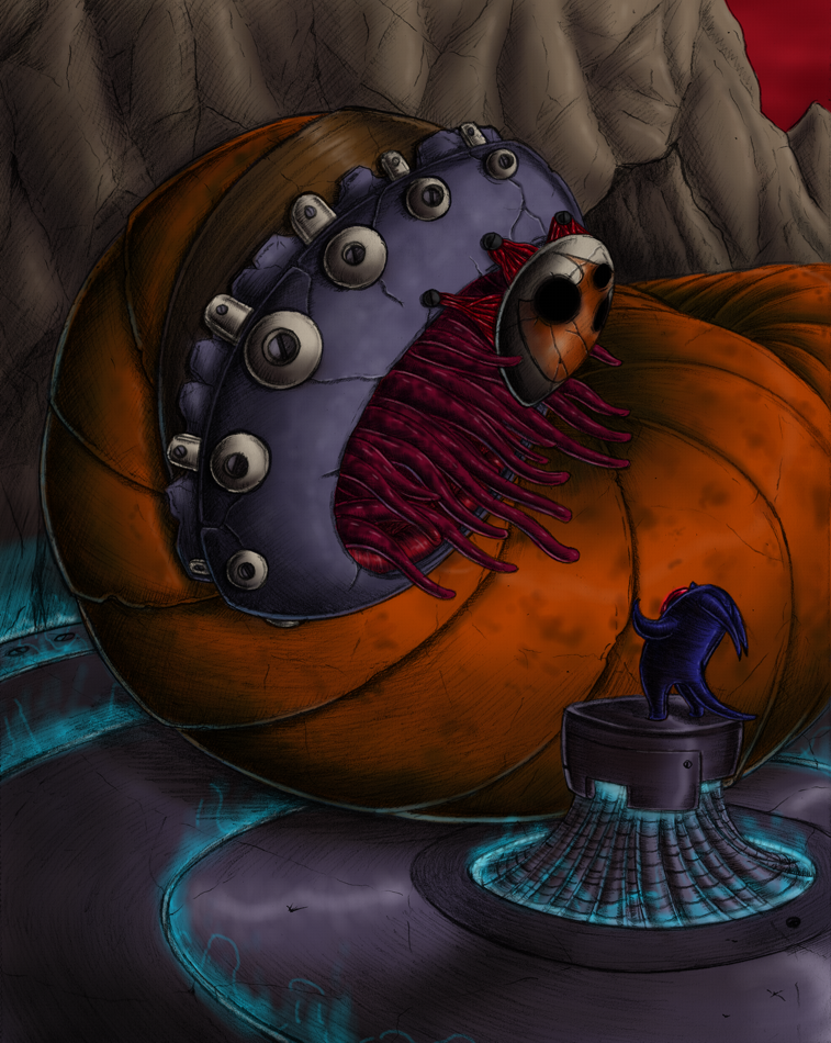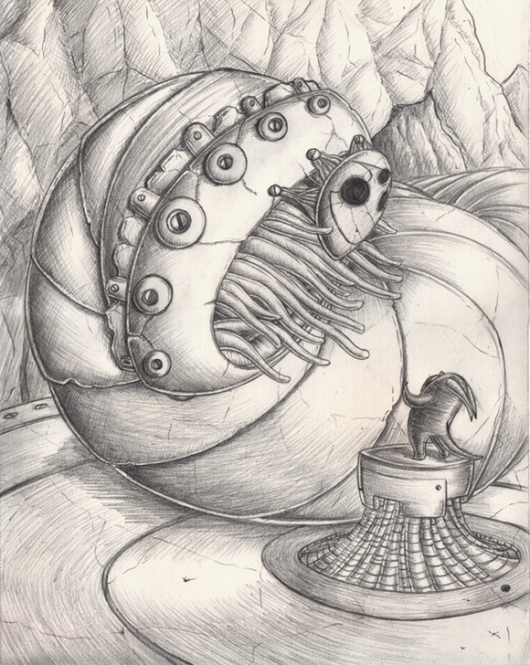 “Only the Imps the know the safe passages that run through the Outer Rim Ridge. Only the Imps know of masked Subterra Angels that dwell within the Ridge. The impossible, segmented bulks winding through caverns and tunnels. Occasionally they find time to play audience to the tiny prayers of their impish visitors. Storytellers claim that the Subterra Angels carry the prayers of the Imps down to the secret heart of the world and plant them there. If they take root and blossom, the prayers will come true and change the world.”